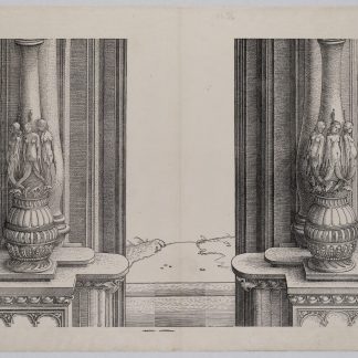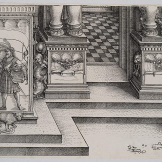 • The Middle Section of the Entryway to the Central Portal, the Columns Decorated by Sirens and Sleeping Soldiers Behind, from the Arch of Honor, proof, dated 1515, printed 1517-18