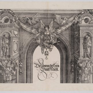 • The Upper Section of the Entryway to the Central Portal with a Winged Figure Holding the Imperial Crown, from the Arch of Honor, proof, dated 1515, printed 1517-18