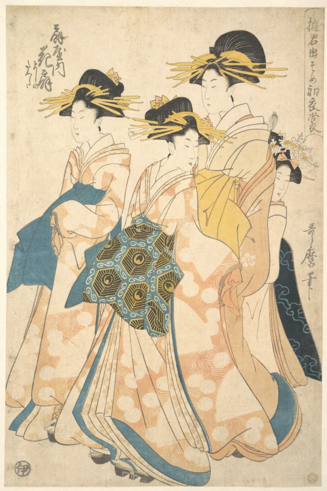 The Oiran Hanaogi of Ogiya attended by Two Shinzo and Her Kamuro Yoshino