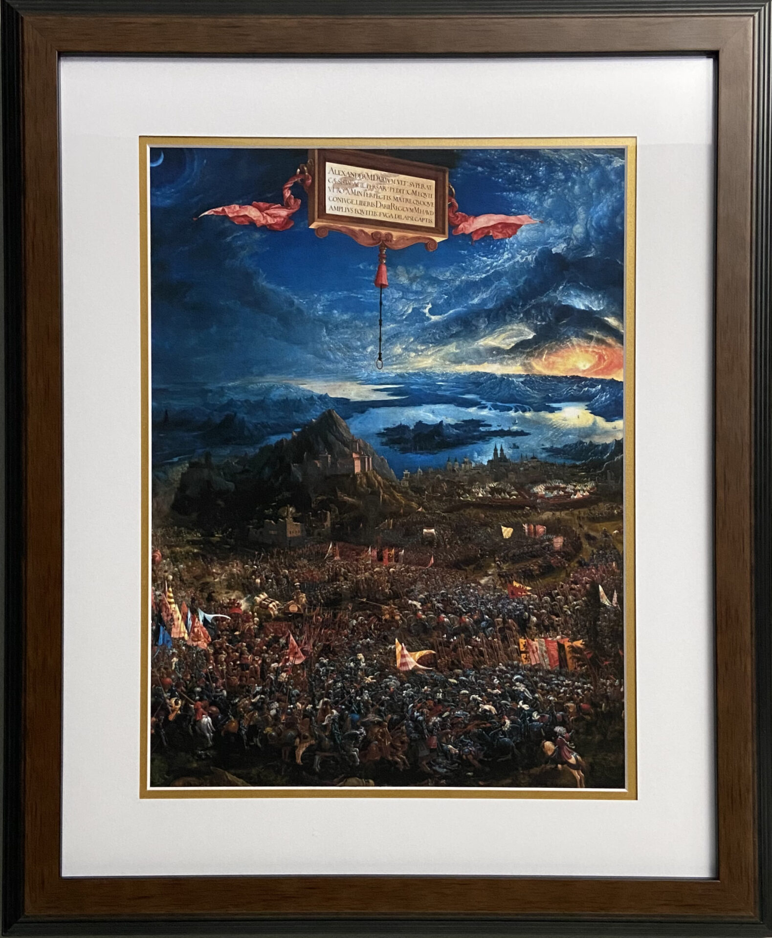 The Battle of Alexander at Issus (German: Alexanderschlacht) is a 1529 oil painting by the German artist Albrecht Altdorfer (c. 1480–1538), a pioneer of landscape art and a founding member of the Danube school. The painting portrays the 333 BC Battle of Issus, in which Alexander the Great secured a decisive victory over Darius III of Persia and gained crucial leverage in his campaign against the Persian Empire. The painting is widely regarded as Altdorfer’s masterpiece, and is one of the most famous examples of the type of Renaissance landscape painting known as the world landscape, which here reaches an unprecedented grandeur.