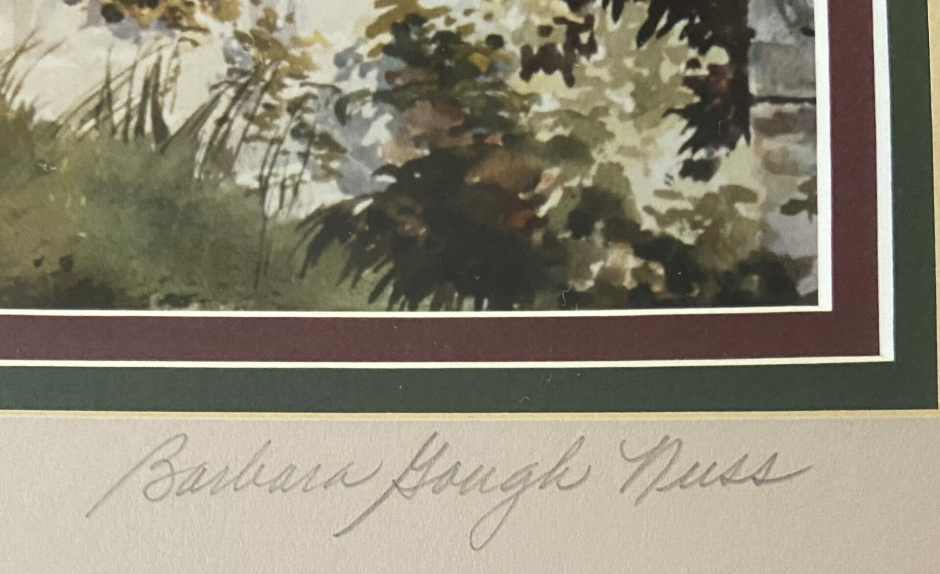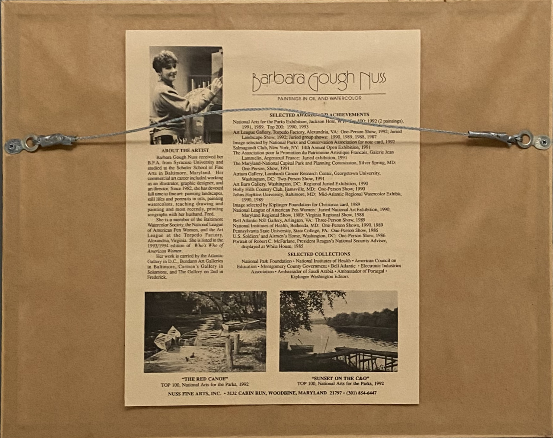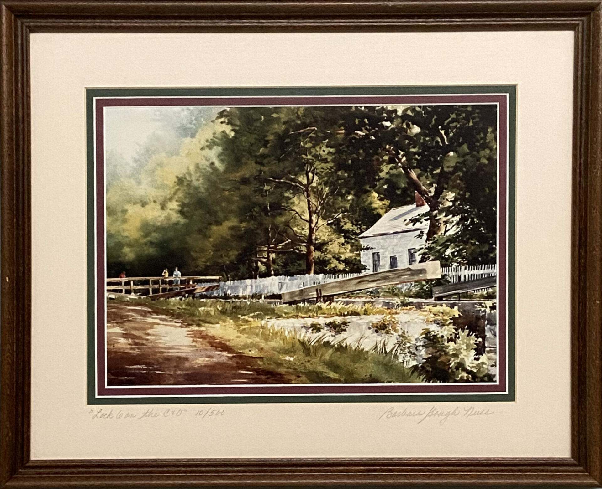 Barbara Gough Nuss – Signed and Numbered Limited Edition (10/500) of “Lock 6 on C&O”.  Painting of “lock 6” of The Chesapeake and Ohio Canal which was started in 1828 as a dream of passage to Western wealth. Operating for nearly 100 years, the canal was a lifeline for communities along the Potomac River as coal, lumber and agricultural products floated down the waterway to market. After closing due to competition from the railroads and the destruction of floods, the area languished in disrepair until it became a target for a parkway in the 1950s. Supreme Court Justice William O. Douglas rallied support for developing the canal as a linear park, and in 1971, it became a National Historical Park.