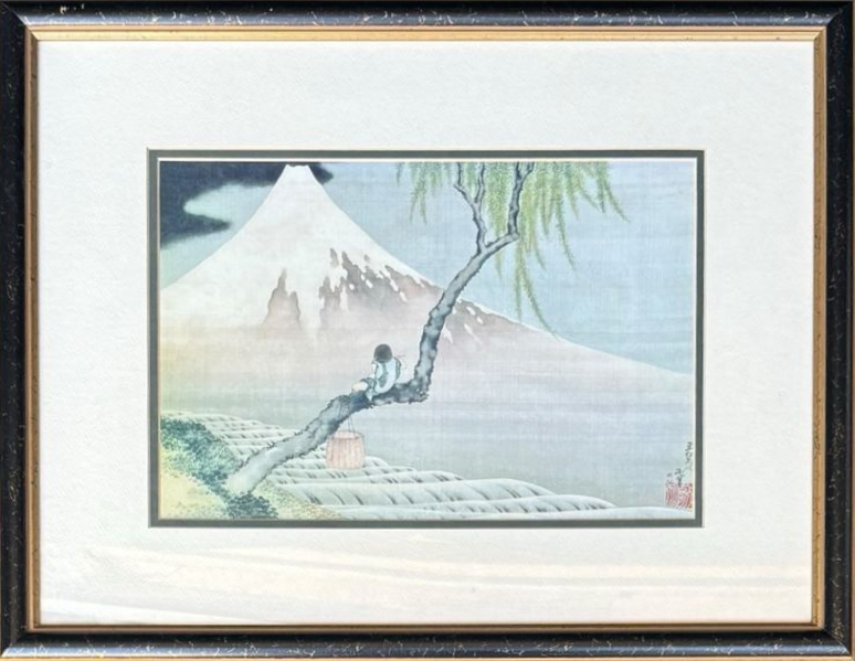Hatsuhika Hokusai – “Boy Viewing Mount Fuji”. Japanese Woodblock print. (Noted Glare from photo on bottom).