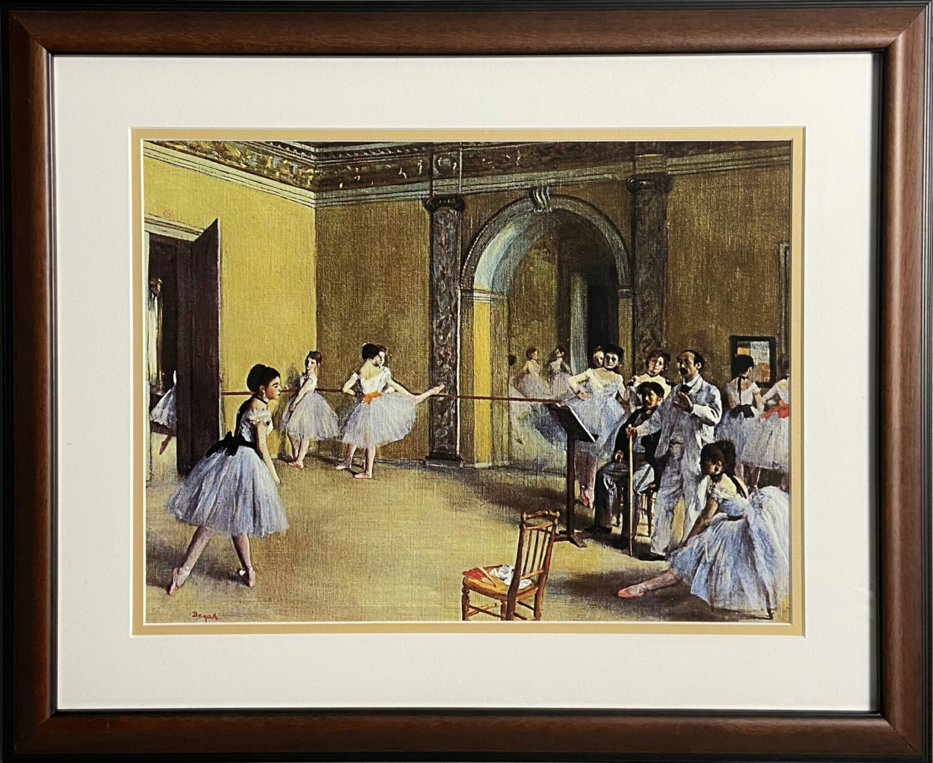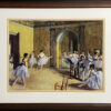 Degas regularly went to the Paris opera house, not only as a member of the audience, but as a visitor backstage and in the dance studio, where he introduced by a friend who played in the orchestra. At that time, the opera was still housed in the rue Le Peletier and had not yet moved to the building designed by Garnier which was soon to replace it. From the 1870s until his death, Degas’s favourite subjects were ballerinas at work, in rehearsal or at rest, and he tirelessly explored the theme with many variations in posture and gesture. More than the stage performance and the limelight, it was the training and rehearsals that interested him. Here the class is coming to an end – the pupils are exhausted, they are stretching, twisting to scratch their backs, adjusting their hair or clothes, an earring, or a ribbon, paying little heed to the inflexible teacher, a portrait of Jules Perrot, a real-life ballet master.