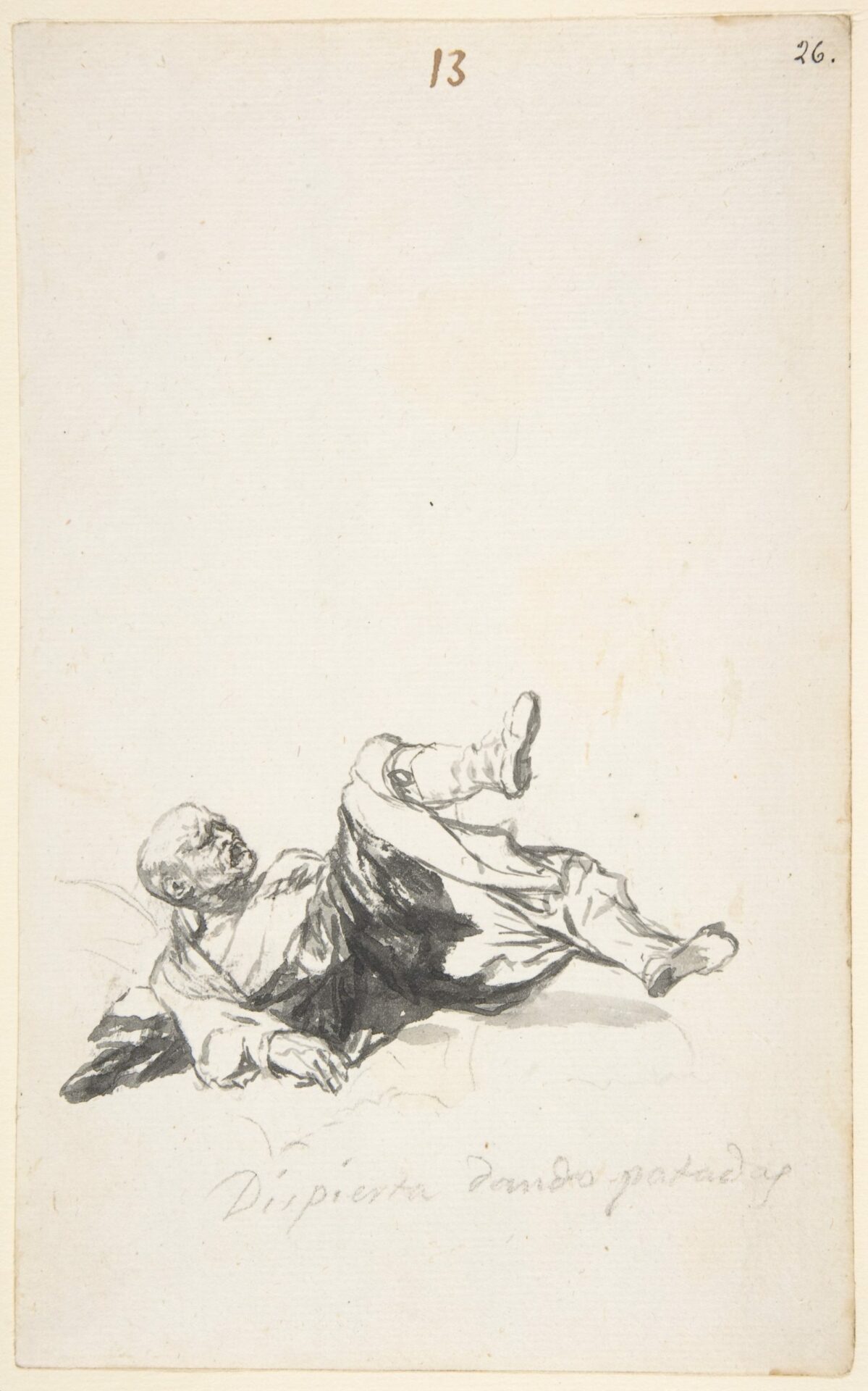 ‘He Wakes Up Kicking’; a man on the floor kicking his legs after waking from a nightmare; page 13 from the Witches and Old Women Album (D)