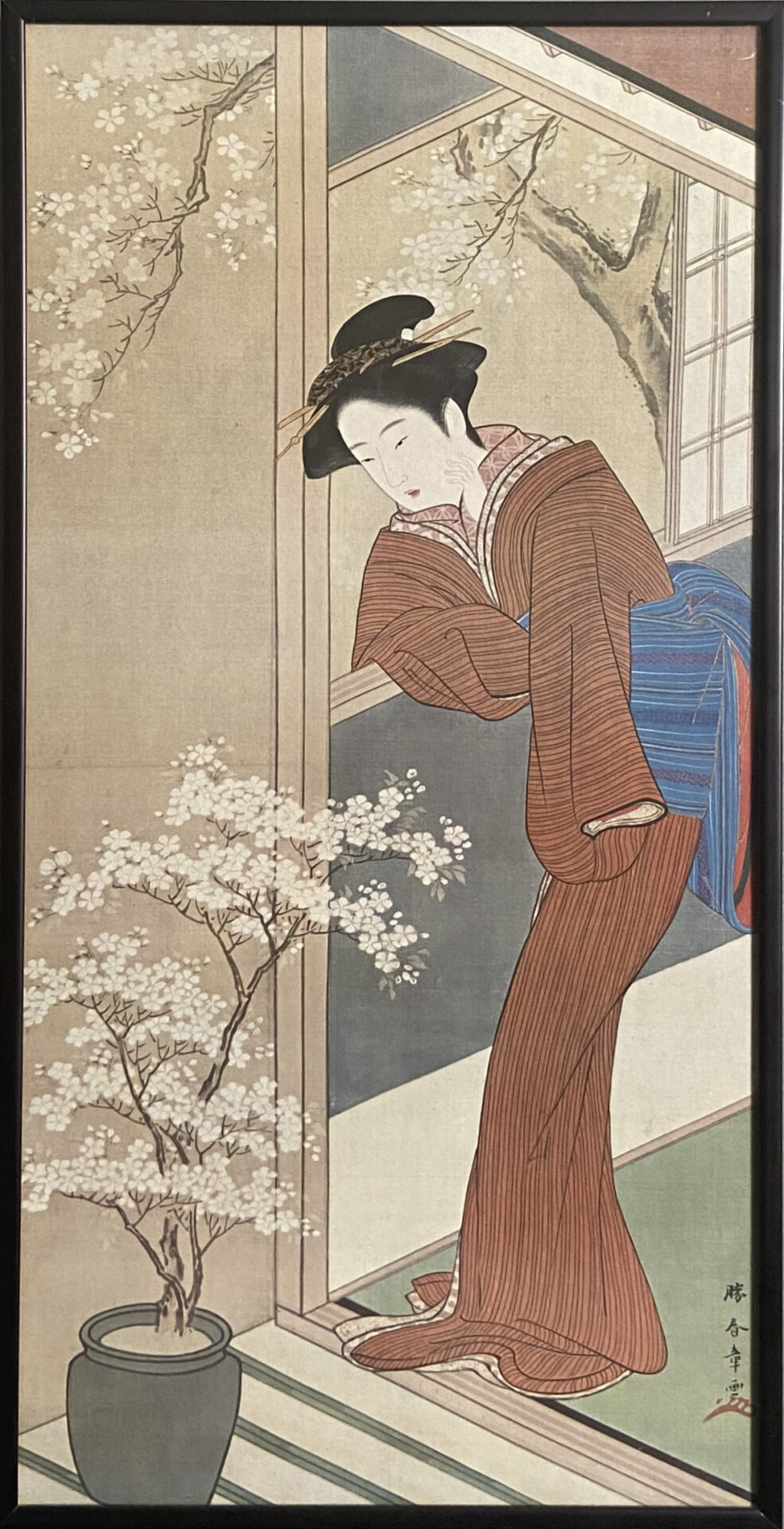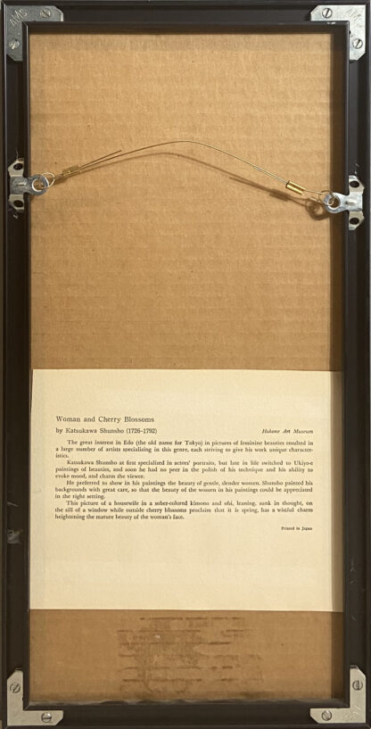 He preferred to show in his paintings the beauty of genue, slender women. Shunsho painted his backgrounds with great care, so that the beauty of the women in his paintings could be appreciated in the right setting. This picture of a housewife in a sober-colored kimono and obi, leaning, sunk in thought, on the sill of a window while outside cherry blossoms proclaim that it is spring, has a wistful charm heightening the mature beauty of the woman’s face.