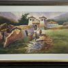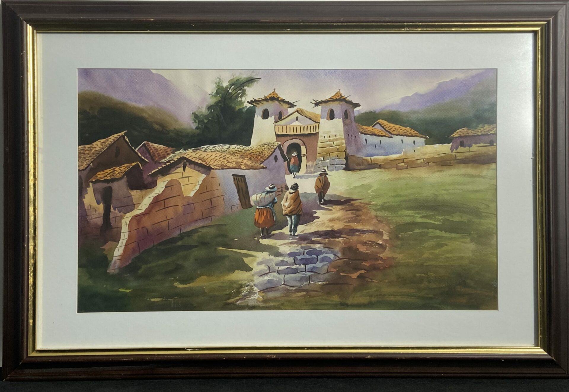 Signed vintage original watercolor of a Peruvian village. Some framing imperfections noted.