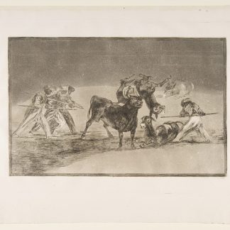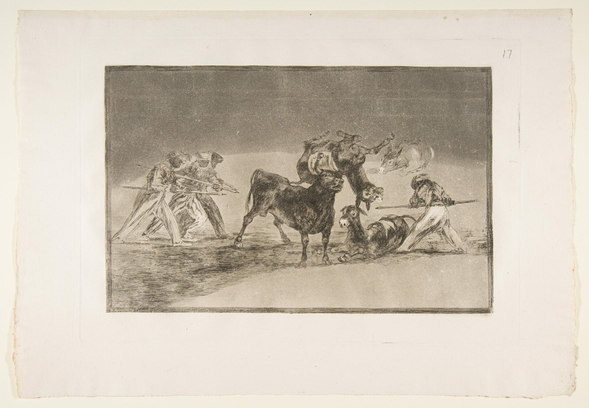 Plate 17 of the ‘Tauromaquia’: The Moors use donkeys as a barrier to defend themselves against the bull whose horns have been tipped with balls.
