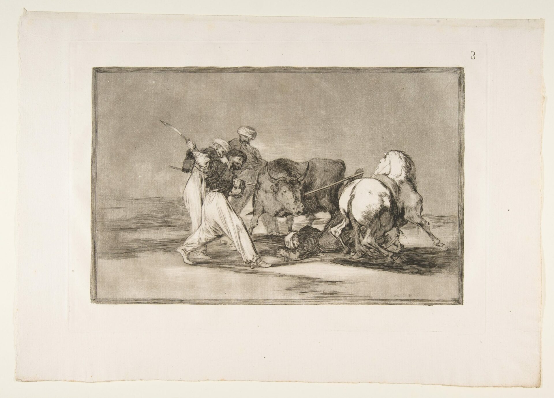Plate 3 from the ‘Tauromaquia’:The Moors settled in Spain, giving up the superstitions of the Koran, adopted this art of hunting, and spear a bull in the open