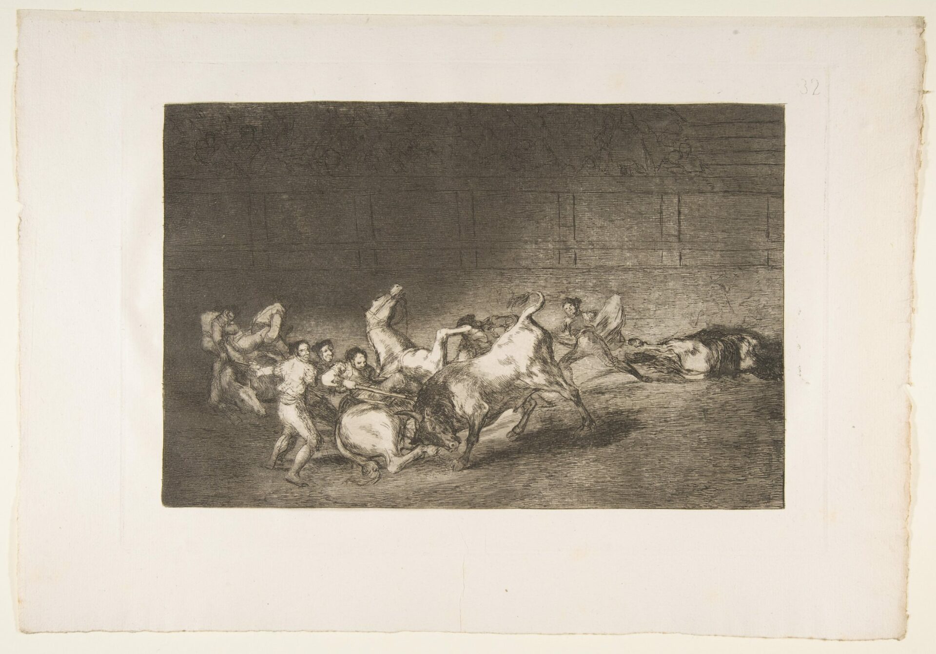 Plate 32 from the ‘Tauromaquia’:Two teams of picadors thrown one after the other by a single bull.