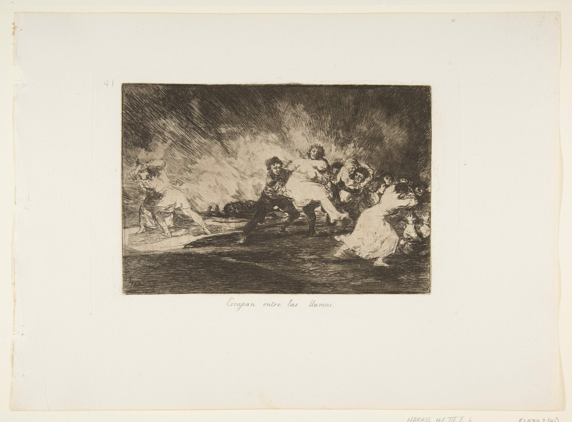 Plate 41 from ‘The Disasters of War’ (Los Desastres de La Guerra): ‘They escape through the flames.’ (Escapan entre las llamas)