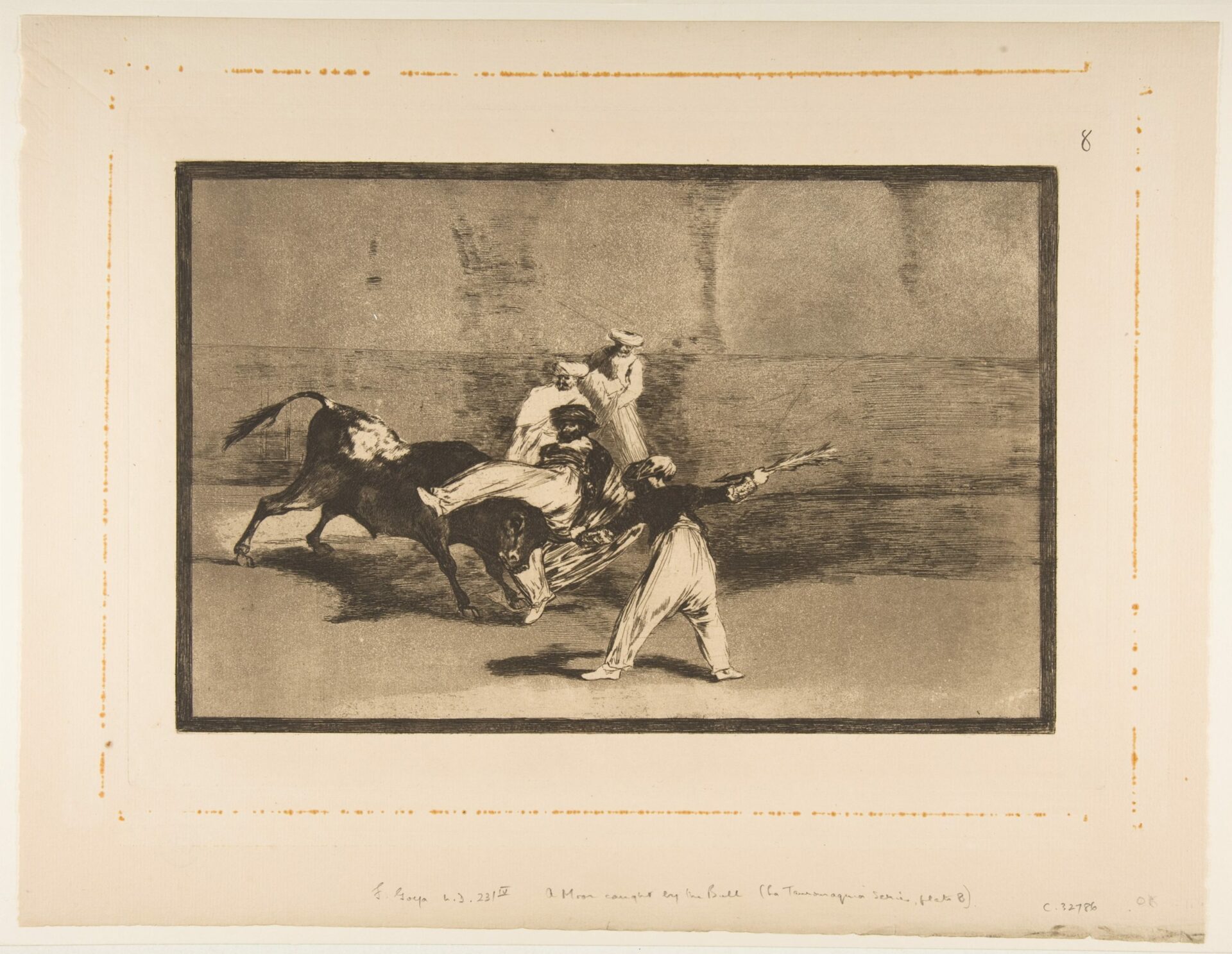 Plate 8 from the ‘Tauromaquia’: A moor caught by the bull in the ring