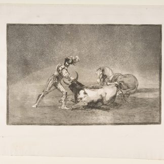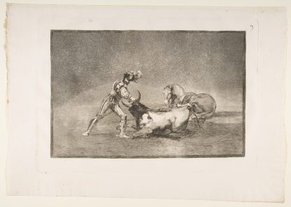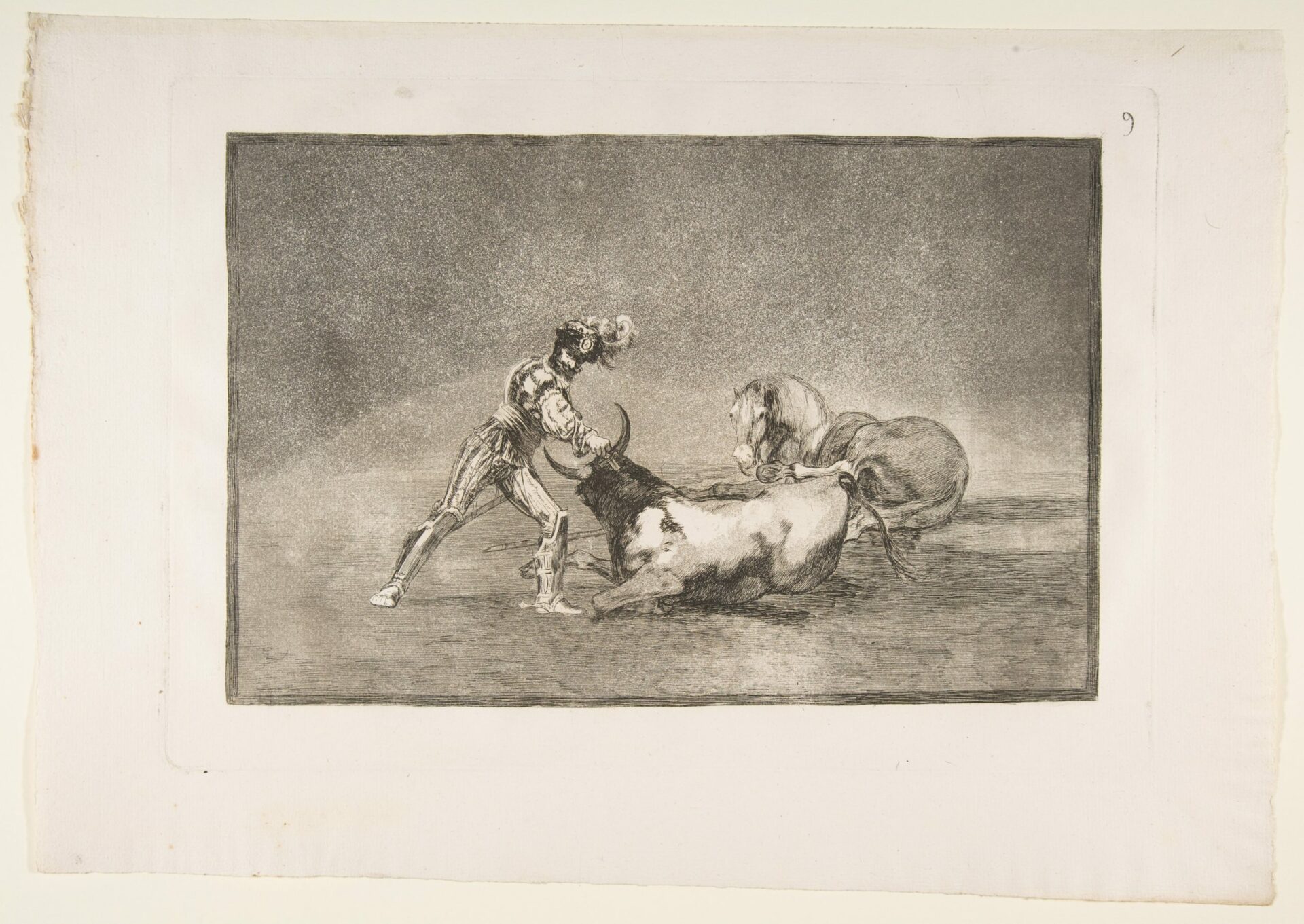 Plate 9 from the ‘Tauromaquia’: A Spanish knight kills the bull after having lost his horse.