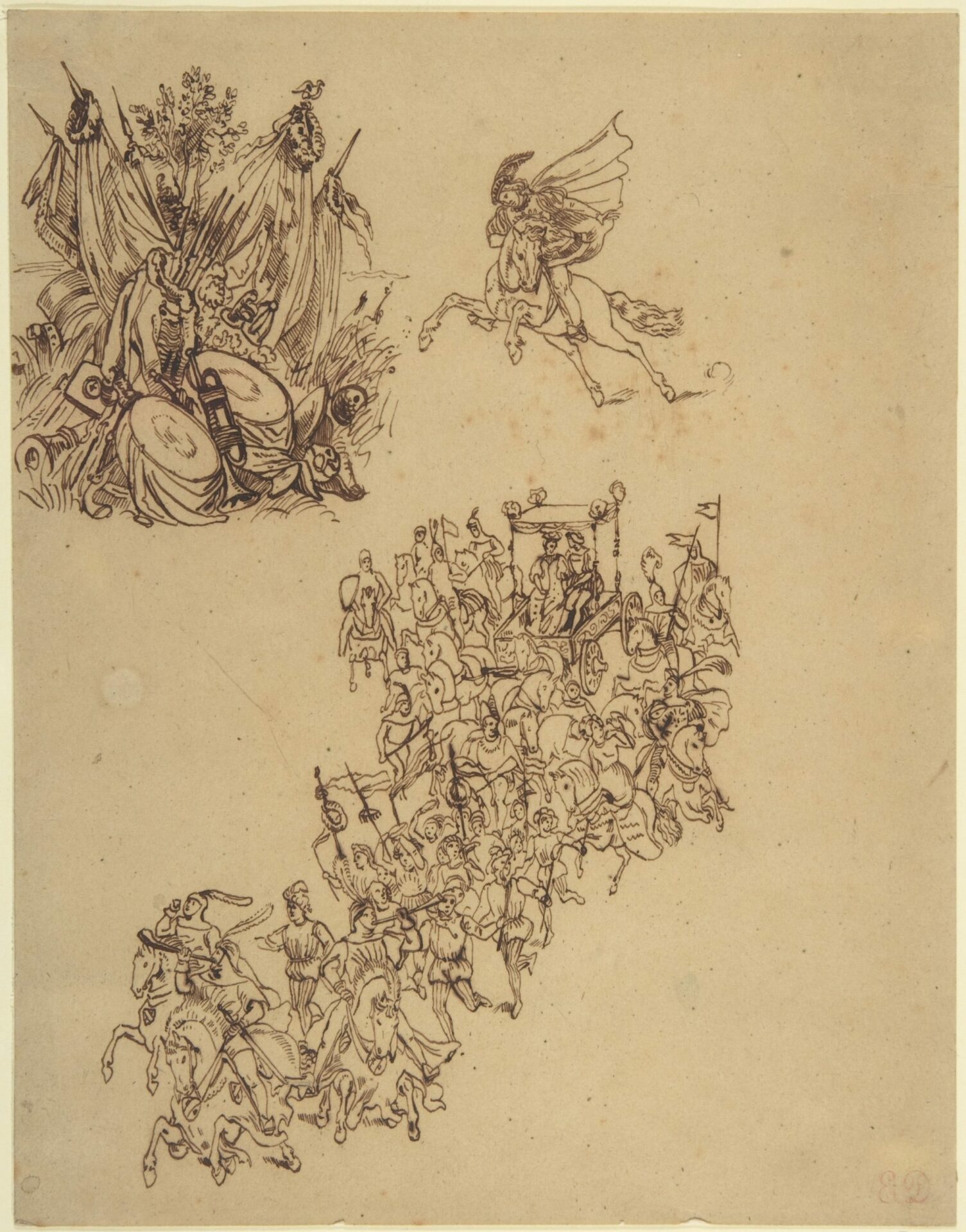 Sheet of Studies: A Marriage Procession in Sixteenth Century Dress; a Cavalier; and a Trophy of Arms