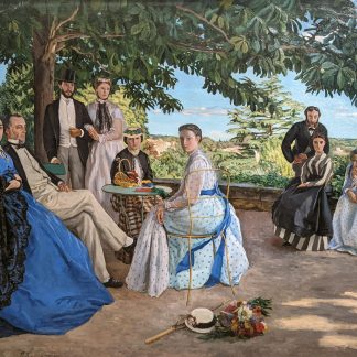 The impressionist painting depicts young men dressed in swimsuits having a leisurely day along the banks of Lez river near Montpellier. Bazille achieved the look he wanted for the painting by first drawing the human figures in his Paris studio and then transporting the drawings to the outdoor setting. Like his earlier painting Réunion de famille (1850), Scène d’été captured friends and family members in the outdoors and was exhibited at the Paris Salon in 1870.
