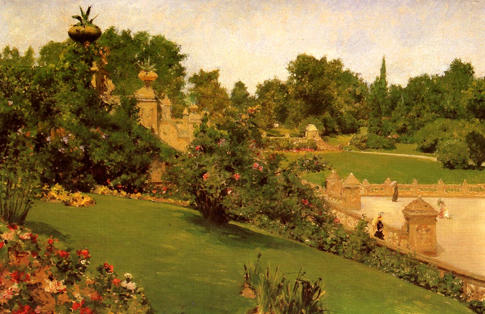 The Central Park Mall was a favorite subject for late-century impressionists and urban realists. Chase depicts the garden outside the mall and the mall surrounded by trees.