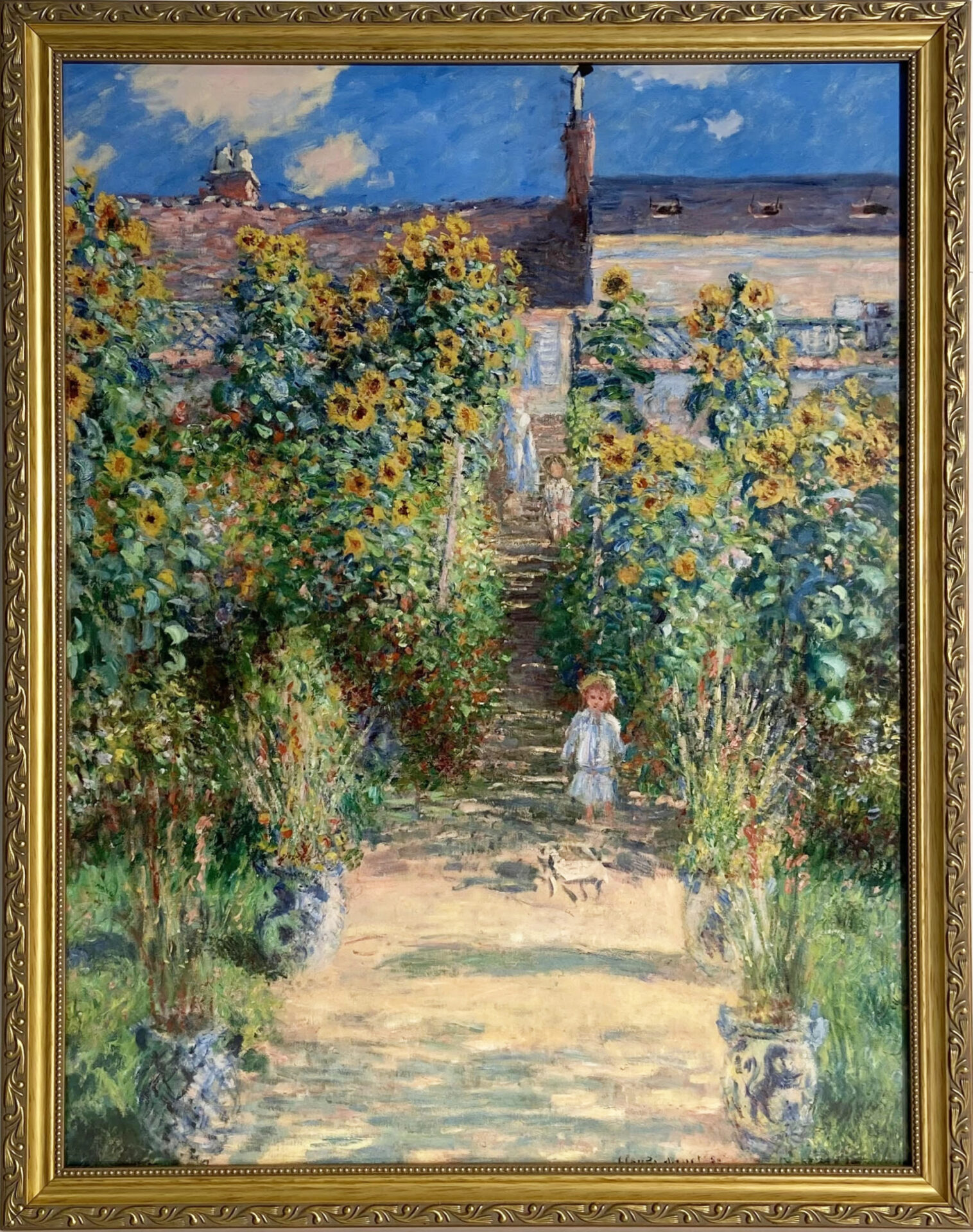 Monet planted gardens wherever he lived. When he rented this house at Vétheuil, he made arrangements with the owner to landscape the terraces, which lead down to the Seine. The boy with the wagon is Monet’s young son, and on the steps behind him are other members of his extended household.