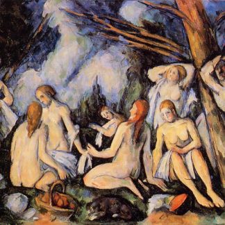 With each version of the Bathers, Cézanne moved away from the traditional presentation of paintings, intentionally creating works that would not appeal to the novice viewer. He did this to avoid fleeting fads and give a timeless quality to his work, and in so doing paved the way for future artists to disregard current trends and paint pieces that would appeal equally to all generations. The abstract nude females present in Large Bathers give the painting tension and density. It is exceptional among his work in symmetrical dimensions, with the adaptation of the nude forms to the triangular pattern of the trees and river. Using the same technique as employed in painting landscapes and still lifes, Large Bathers is reminiscent of the work of Titian and Peter Paul Rubens. Comparisons are also often made with the other famous group of nude women of the same period, Picasso’s Les Demoiselles d’Avignon.