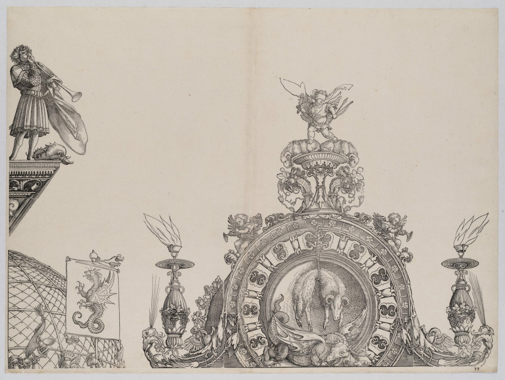 The Pinnacle of the Right Portal; and a Trumpeter and Standard from the Central Portal, from the Arch of Honor, proof, dated 1515, printed 1517-18