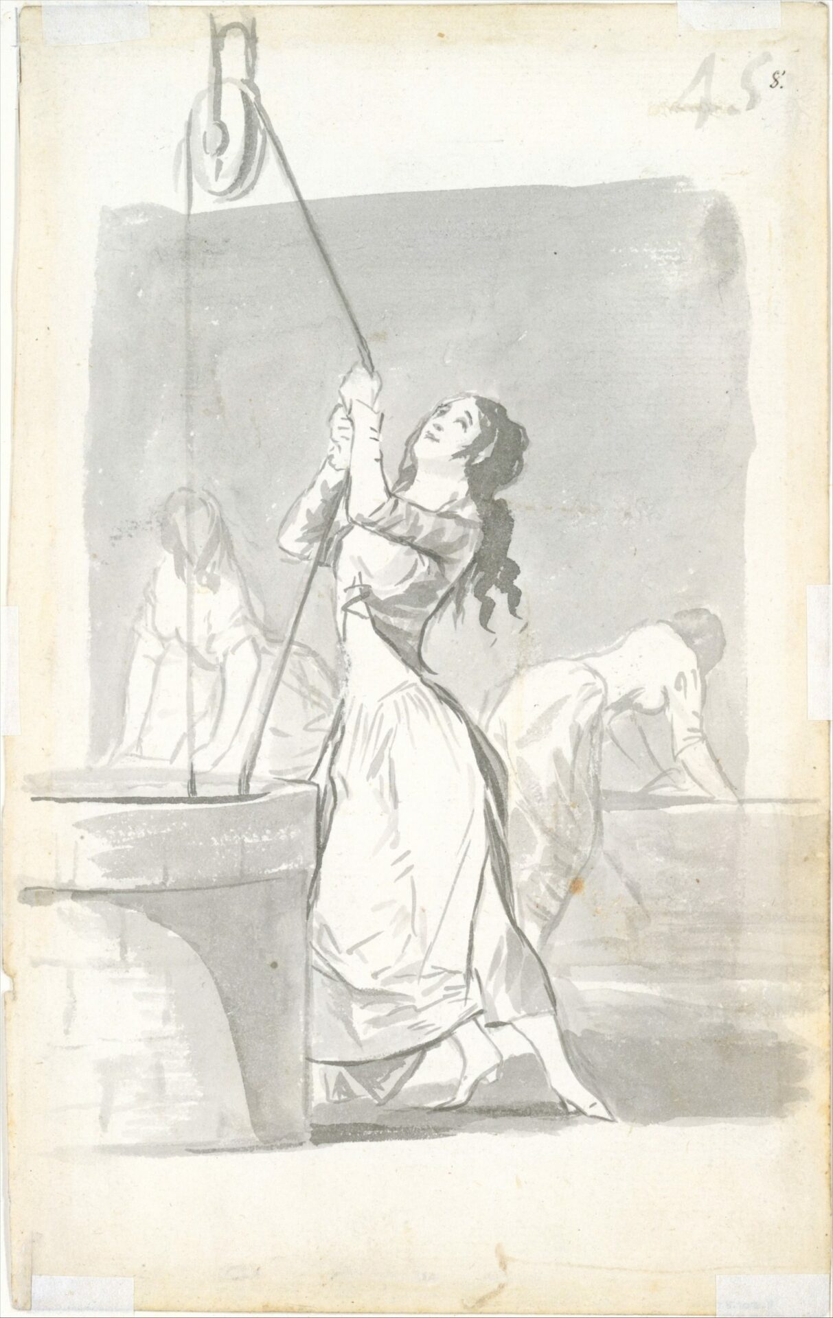 Three women, one in the foreground drawing water from a well, two in the background washing; folio 45 (recto) from the Madrid Album ‘B’.