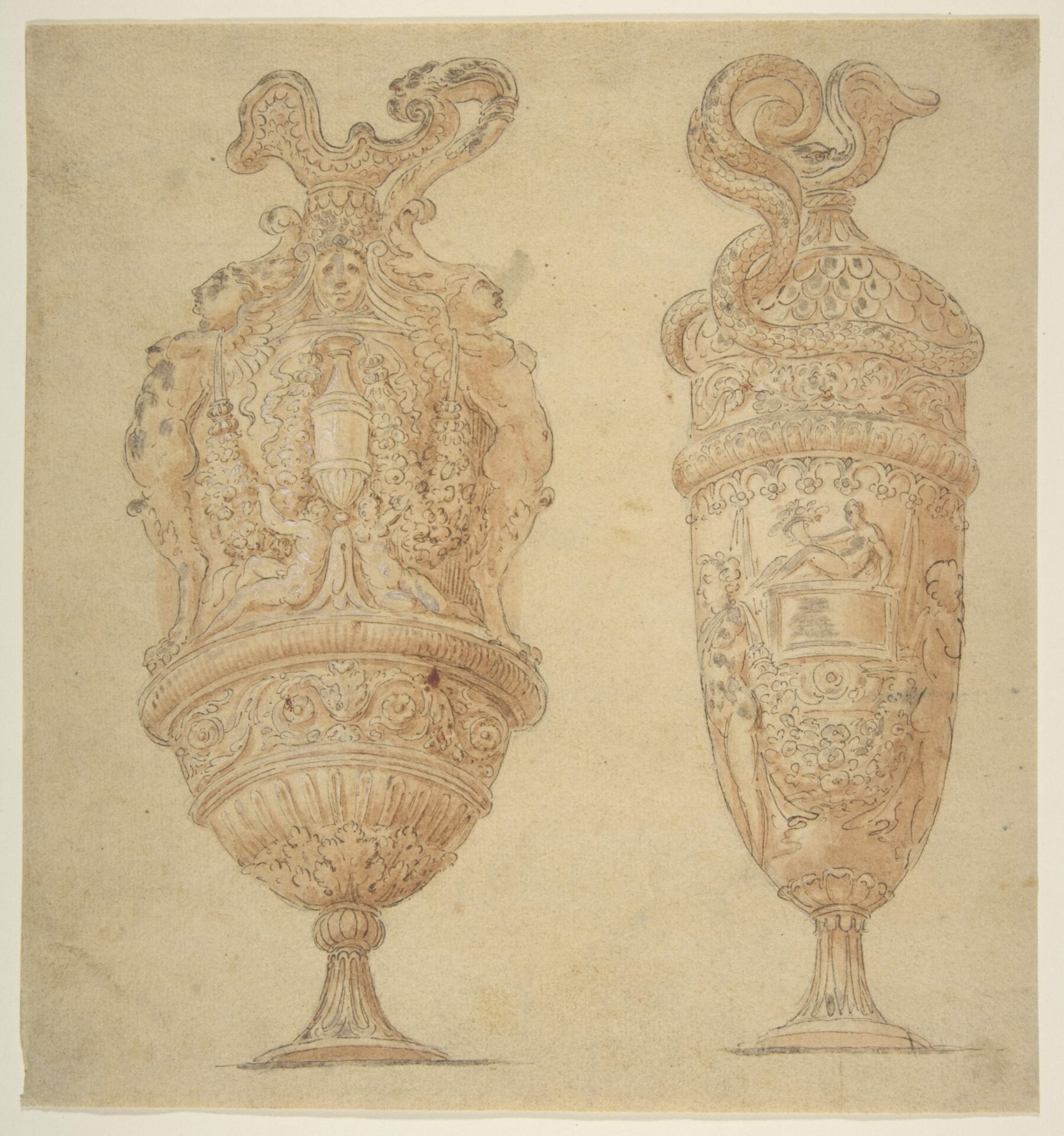 Two Urns Decorated with Human Figures, Animals and Garlands.