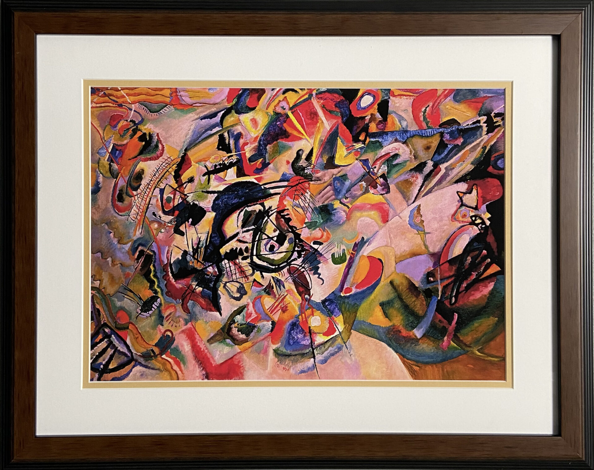 Kandinsky’s preliminary study was his first abstract watercolor. Untitled (Study for Composition VII, Première abstraction), painted in 1913, is one of the first artworks to emerge from the representational tradition of Western European painting entirely, shedding references to well known forms, conventions of material representation and all narrative allusions. The watercolor is the first extant entry in Wassily Kandinsky’s parallel series of abstract “Compositions” and “Improvisations” that began to emerge during his Blue Rider Period. Though the work is dated 1910, art historians believe the date is apocryphal, and that Kandinsky dated the work in 1913.